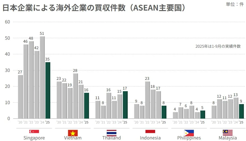編集部では、M&A調査会社のレコフのデータをもとに、日本企業によるASEAN企業の買収(IN-OUT)の推移を確認した。掲載している棒グラフは、過去5年間と2025年1~9月の国別件数の傾向を視覚化している。